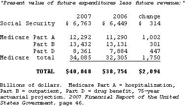 Add to the liability for Medicare and Social Secutity the reported increase in other on-balance sheet liabilities of $290 billion, and the one-year in increase in the net liabilities of the federal government becomes $2.384 trillion. (And there's more, the real final number is bigger yet -- I'm not counting other off-balance sheet liabilities for the likes of Medicaid, federal and military pensions and such because I don't want to become too depressed to continue).