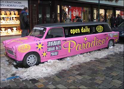 The 24-year-old from the eastern village of Bruchmuehle has tuned his 1980 "Trabi", the smelly two-cylinder symbol of communist East Germany, into the hip-hop generation with a booming sound system and lowered suspension. Stuck to the plastic bumper is a placard reading "DDR".